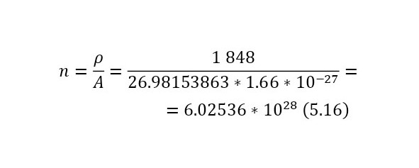Теперь, когда сечение известно, для этой реакции, остаётся ввести число взаимодействий (19), перед этим вычислим число атомов на кубометр (16) и указав толщину пластины в 78 мкм, поскольку пробег протона (максимальное расстояние на котором может пройти при определённой энергии) с энергией 3 МэВ составляет это значение.