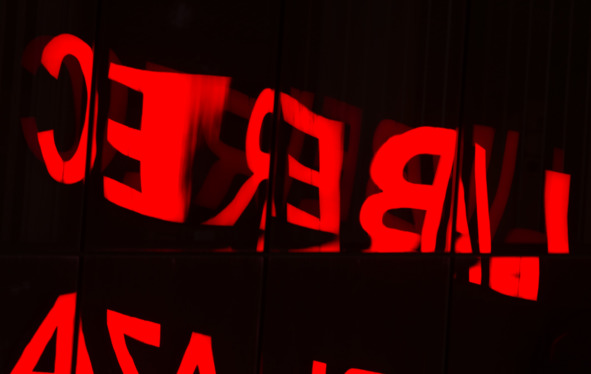 Напротив костела стоит большой торговый центр, на крыше которого горят ярко-красные неоновые буквы, они, в свою очередь, отражаются в стекле современного здания напротив.