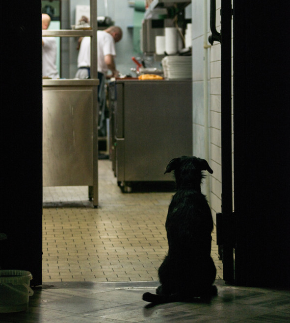 Вот еще один пес – сидит ровно у порога кухни кафе. Ни на полкоготка за порог. Он полон великого чешского ожидания.