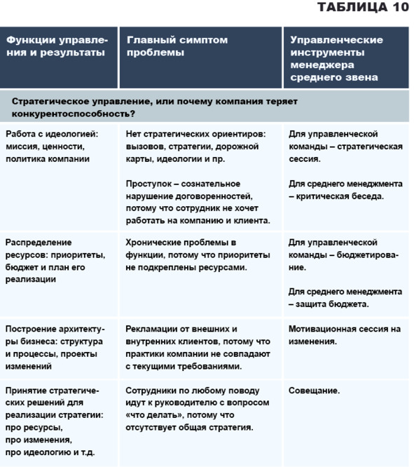 Взгляните на таблицу, которую мы разработали для одной клиентской компании, чтобы помочь начинающим руководителям сориентироваться в различных управленческих задачах. Несмотря на кажущееся многообразие, подавляющее большинство организационных проблем решается 12 типовыми функциями руководителей и ограниченным набором стандартных управленческих инструментов.