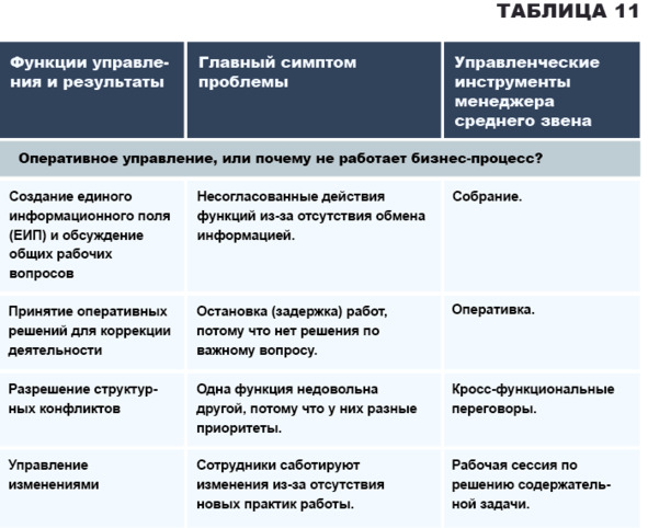 – Оперативное управление – кросс-функциональное взаимодействие разных подразделений. Это реализация руководителями среднего уровня в кооперации друг с другом стратегии компании через организацию, координацию, коррекцию работ функциональных команд для бесперебойного осуществления бизнес-процесса.