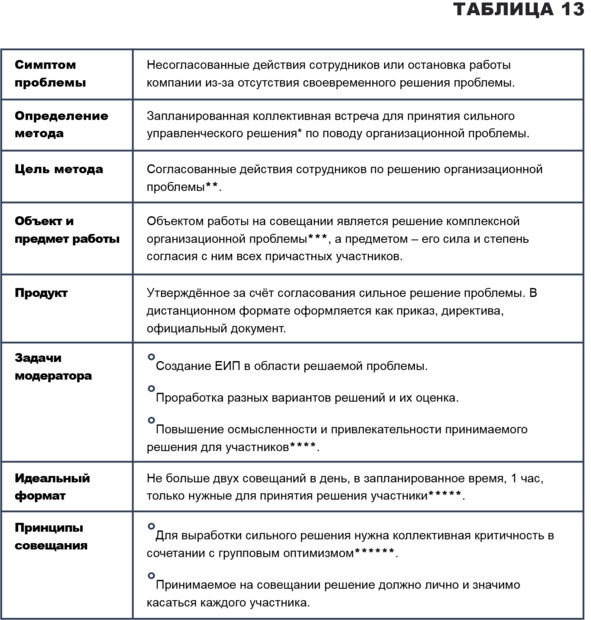 У каждого метода групповой работы – управленческого инструмента – существует своя зона адекватности. То есть он предназначен для решения типовой управленческой задачи. Поэтому, выбирая метод, руководителю стоит ориентироваться именно на неё и действовать по принципу «одна задача за одну встречу».