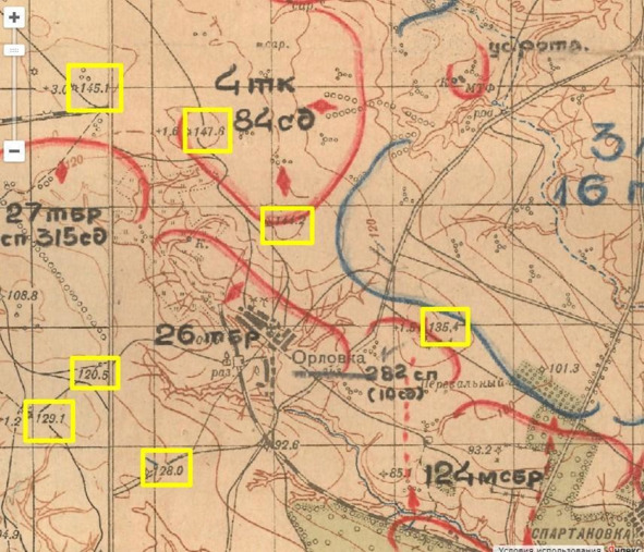 Фрагмент Карты СтаФ (29.8—31.8.1942 г.; Жёлтым выделены Орловские высоты)