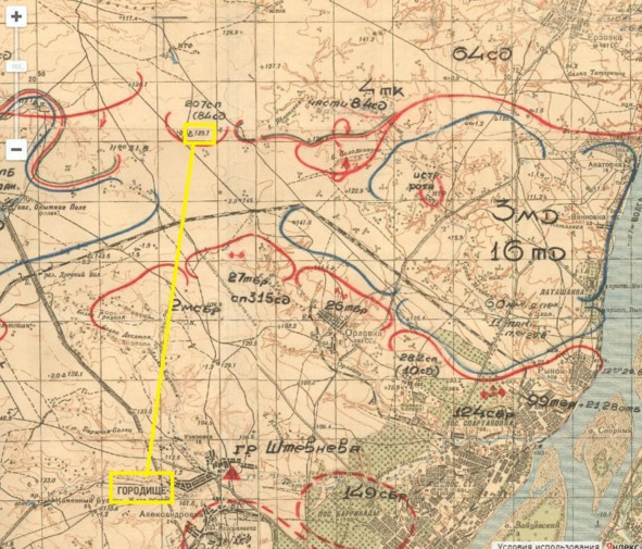 А это – расстояние от рабочего посёлка Городище до ключевой высоты на «Солдатском поле» (высота 139.7, от которой лично Иван Васильевич Суворов, используя простые карты, пытался восстановить хронологию событий тех страшных дней).