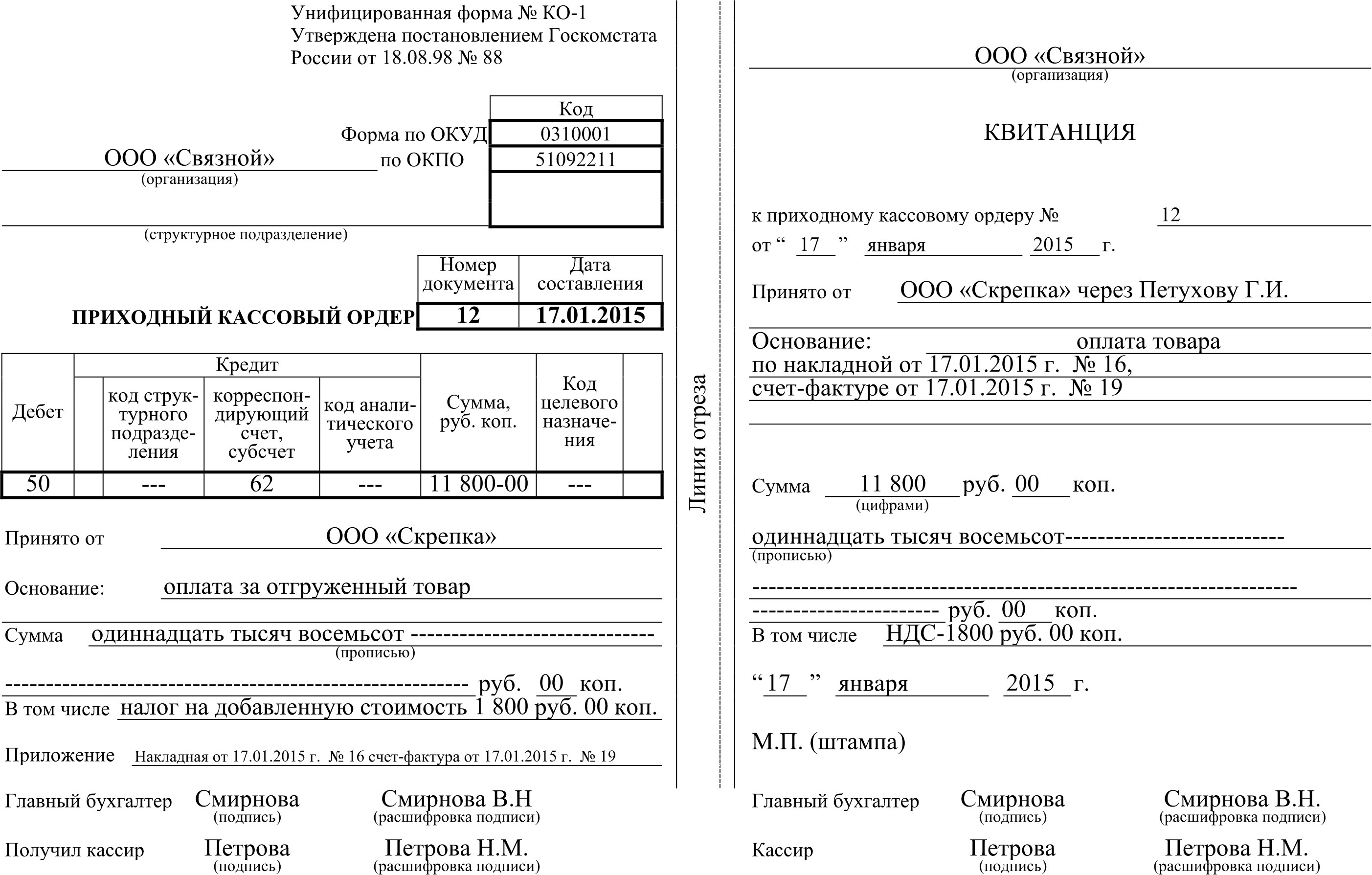 Поступление денежных средств в кассу организации оформляется приходным кассовым ордером (форма № КО-1), который выписывается работником бухгалтерии в одном экземпляре и заверяется подписями главного бухгалтера и кассира, квитанция к нему заверяется печатью организации.