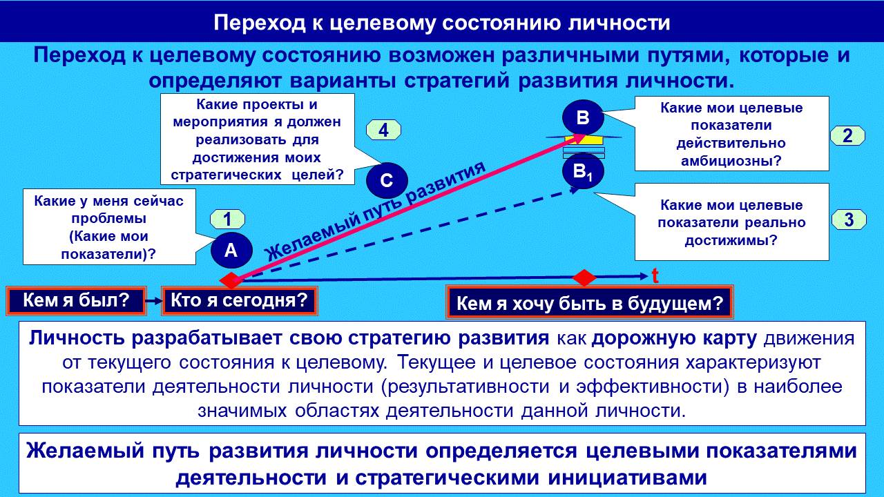 Итак, личность разрабатывает свою стратегию развития как дорожную карту движения от текущего состояния к целевому. Текущее и целевое состояния характеризуют показатели деятельности личности (результативности и эффективности) в наиболее значимых областях деятельности данной личности.