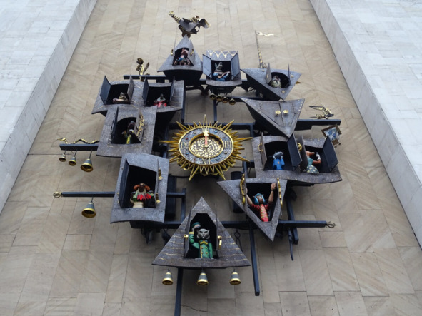 Сергей Образцов давно хотел, чтобы на фасаде театра висели часы, похожие на пражские куранты с движущимися фигурками – древнейшие механические часы в мире: первая фигурка была создана в 1490 году. Над огромным циферблатом – два окошка, открывающиеся каждый час, в них фигурки выезжают одна за другой, внизу в колокольчик звонит каменный скелет. Театральное представление завершает крик золотого петуха.