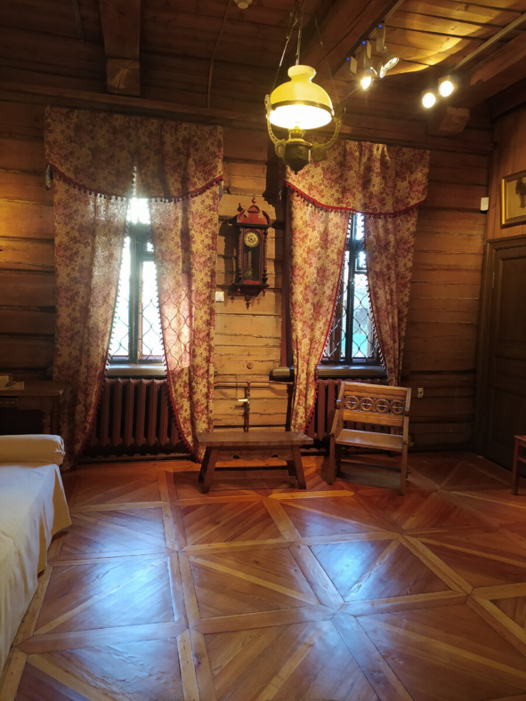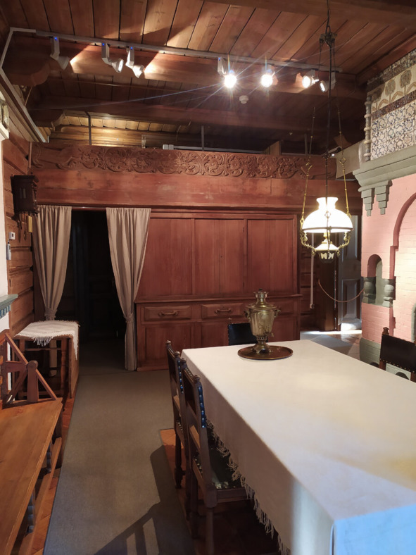 Мемориальные дубовая скамеечка с наклонными ножками и резное переметное кресло в комнате дочери художника – работа абрамцевских мастеров.