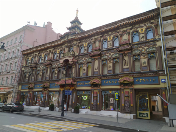 Необычный чайный дом в Москве появился в девяностые годы девятнадцатого века на месте бывшего обветшавшего имения Измайловых (улица Мясницкая дом 19), выкупленного купцом и торговцем чая – Сергеем Васильевичем Перловым. То, что осталось от имения снесли, а на этом месте поручили архитектору Роману Клейну построить комплекс зданий: складские помещения, контору, чаеразвесочный цех, магазин, жилой дом, предусмотреть место для домашнего театра и хранения китайского фарфора. Разные взгляды возникли у заказчика и архитектора на исполнение центрального фасада, выходящего на Мясницкую улицу. Клейн предлагал выполнить фасад под поздний ренессанс, а Перлов более был заинтересован в китайском стиле. Работа над фасадом досталась молодому архитектору из мастерской Клейна – Карлу Гиппиусу, который и воплотил китайский стиль дома (многие элементы декора были привезены из самого Китая).