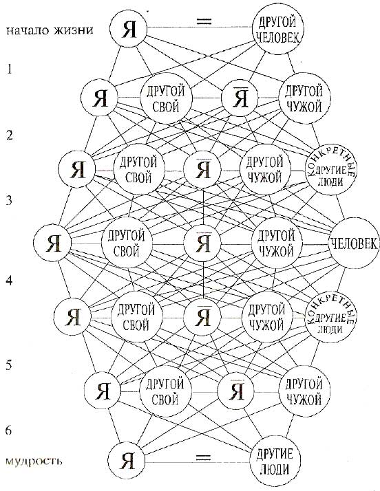 Переживание Я как обоснования активности существует у человека с момента рождения, поэтому на схеме, где обозначено начало жизни, стоит знак Я, которому в течение жизни (обратите внимание на всю схему в целом) предстоит дифференцироваться на Я и не-Я, эта дифференциация сохраняется практически до конца жизни. Мне не хотелось заканчивать схему словом «смерть», поэтому я написала слово «мудрость», которым хотела показать, что на жизненном пути (будет это мгновение или годы – не так важно) человек приходит к переживанию своей экзистенциальной общности с Другими Людьми. В этом переживании Я обретает всю полноту целостности, доступную человеку, он обретает согласие с бытием Я и бытием в Я, то согласие с жизнью, которое делает человека творцом самой жизни.
