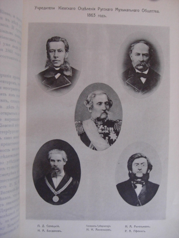 Учредители Киевского Отделения Императорского Русского Музыкального Общества: П. Селецкий, Н. Ригельман, Н. Богданов, Р Пфениг. В центре: генерал губернатор Аненков. Фото из книги автора.