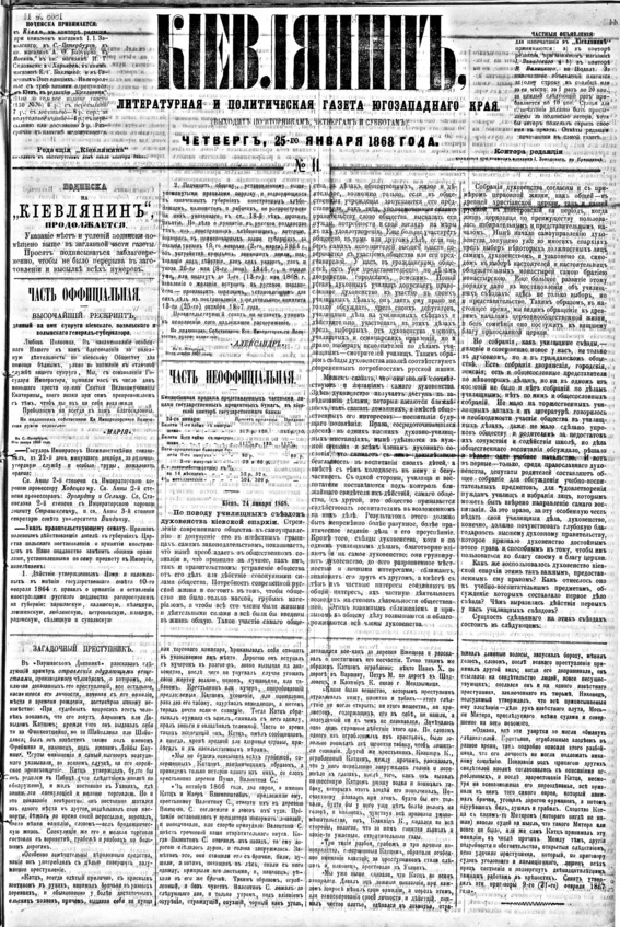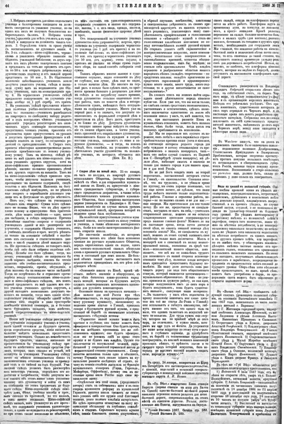 Газета «Киевлянин» за 1868 г. На 2-й странице описание освящения Киевского музыкального училища. Фото из архива авторов.