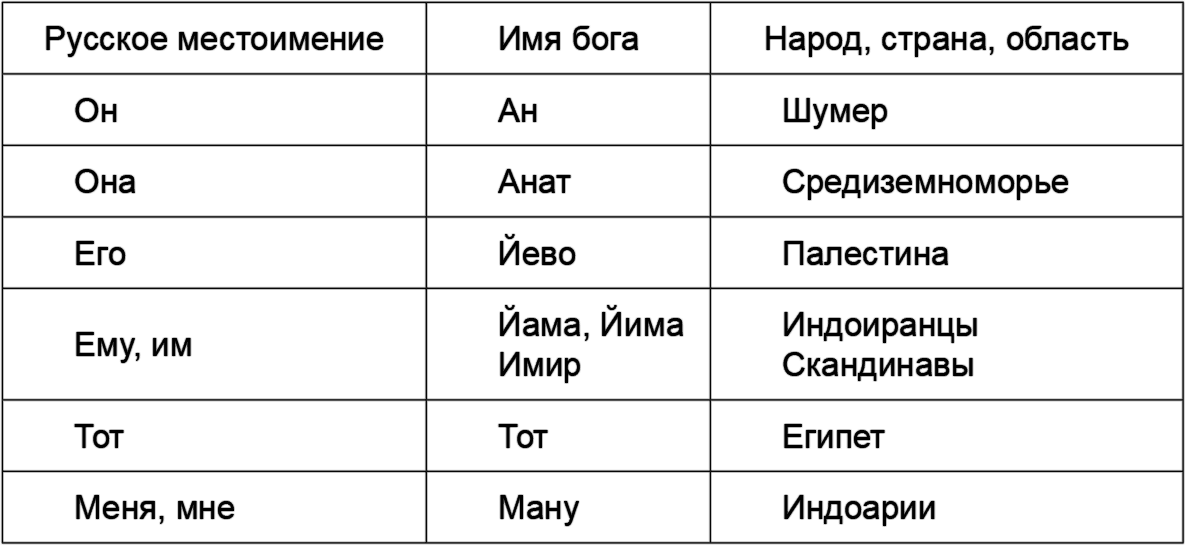 Или еще один, так сказать, «убойный» пример. Основные наши местоимения почему-то практически один к одному совпадают с именами верховных богов у других народов (смотри таблицу).