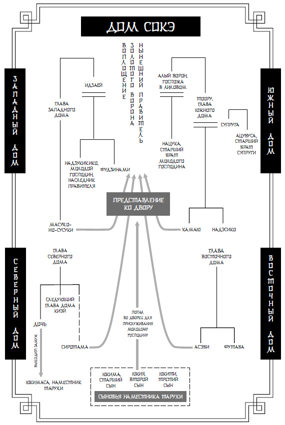 Дом Золотого Ворона, или дом Сокэ, – это семья старейшины рода, первого Золотого Ворона. Легенда гласит, что однажды он поделил страну Ямаути на четыре части и дал по одной каждому из своих детей. С тех пор ими правят четыре дома: восточные земли принадлежат Восточному дому, южные – Южному, западные – Западному, северные – Северному, а весь род Сокэ называют Главным домом.