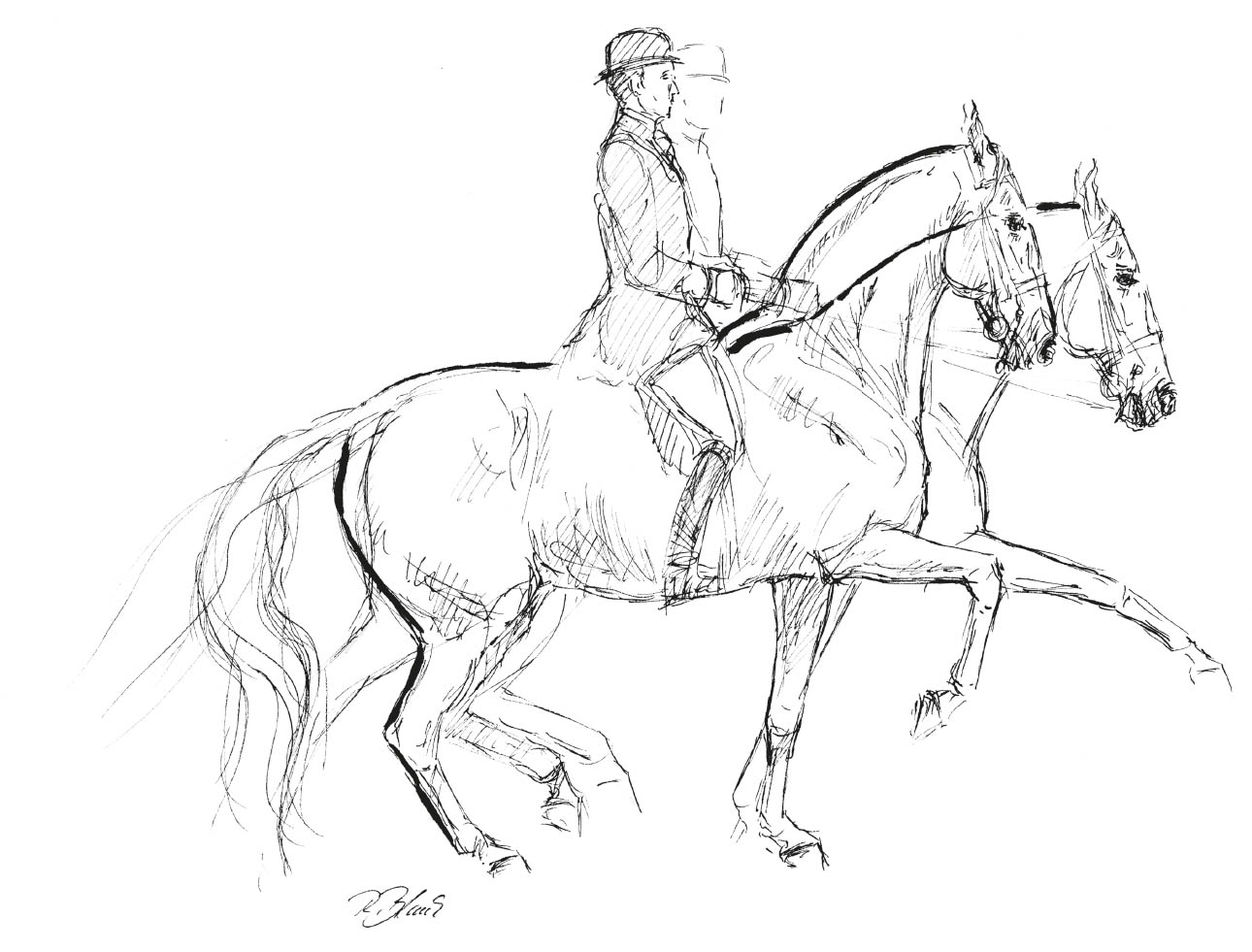 Christoph Ackermann auf seinem Erfolgspferd Champus, wunderbar gezeichnet von Renate Blank. Das reiterliche Haupterfordernis: unsere Pferde in allen Gängen und Touren in die richtige Balance zu bringen und darin zu erhalten.