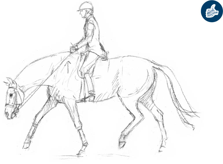Dieser Reitsitz soll sich also empathisch in die Schwerpunktlinie des Pferdes einfügen und darüber hinaus diese so positiv beeinflussen können, dass daraus Bewegungsharmonie entsteht. Das Erreichen der Harmonie jener zwei Lebewesen, die zu einem großen Ganzen zusammenwachsen sollen, steht hier von Anfang an an erster Stelle! Daraus erst erwächst das Kunstwerk aus Pferd und Reiter, bei dem man nicht mehr sagen kann, wer hier wen führt. Damit steht der Reiter in der Pflicht, dem Pferd zu helfen, das Richtige auszuführen und es nicht zu behindern oder gar zu stören. Mit der Bewegung des Pferdes zu sitzen, ohne zum Beispiel gleich in der Trabverstärkung mit dem Oberkörper hinter die Bewegungen des Pferdes zu gelangen, bedarf hoher Konzentration und eines sehr guten Balancesitzes, der selbstverständlich unabhängig von der Hand auch in deutlich verstärkten Gangmaßen agieren können muss.