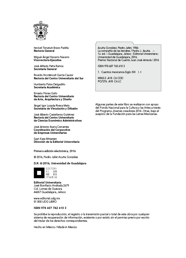 La obra ganadora de esta xv edición es La compañía de las liendres de Pedro J. Acuña (Chihuahua, 1986). El jurado estuvo integrado por Rogelio Guedea, Cecilia Eudave y Luis Armenta Malpica.