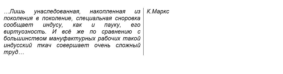 Наемный труд интерпретируется в одних абзацах «Капитала» как легкий, тогда как в других, как виртуозный. Вот то самое двуличие (псевдо)капитализма, когда пытаются навязать что-то чужеродное. Заметьте, как труд ткача пытаются преподнести как сложный в противовес капиталистическому труду, хотя – ткач это делает, находясь свободным от воли капиталиста, и не важно какой затратой труда, т.к. в цене товара все затраты будут учтены. Если товар ткача пользуется спросом и достаток удовлетворяют потребности, то зачем что-то изменять против своих интересов, а тем более становится наемным ткачом на (недо)капиталиста.