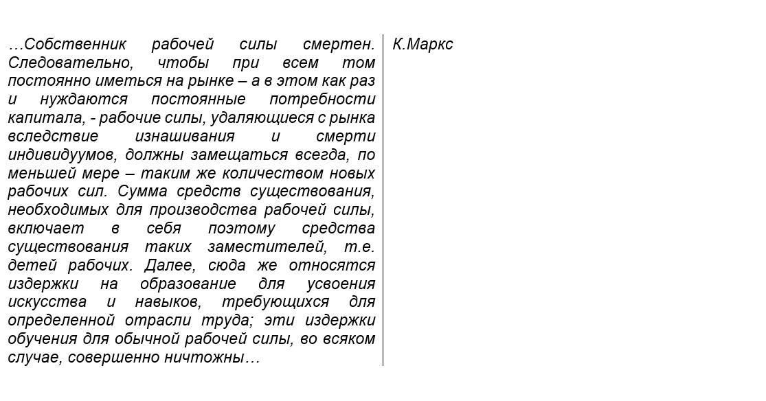 В «Капитале» даже не забыт тот факт, что рабочая сила оказывается смертна, а, соответственно, нужна замена в лице детей этих рабочих, да, именно детей этих рабочих. Дети рабочих являются следующим поколением эксплуатируемых и нет предположений о том, что они могут и смогут подняться на ступеньку выше, чтобы заменить самих (полу)капиталистов и их детей-наследников.