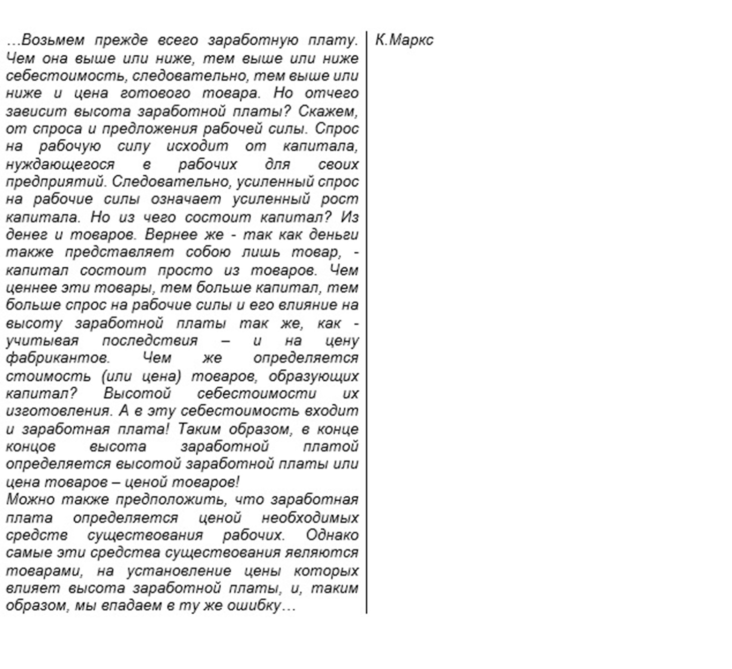 Как вы уже поняли, в произведении «Капитал» одно из основных центров внимания, а может даже единственное, уделено заработной плате наемных рабочих и, складывается впечатление, что каждая строчка и межстрочие книги пропитана единственной мыслью о заработной плате простых наемных, чтобы им ни в коем случае не переплатить, а даже наоборот – недоплатить всеми путями и средствами. Можно с полной уверенностью утверждать, что вопрос даже не в самой заработной плате, а возможности с помощью ее привязать человека к наемной работе и (анти)капиталисту.