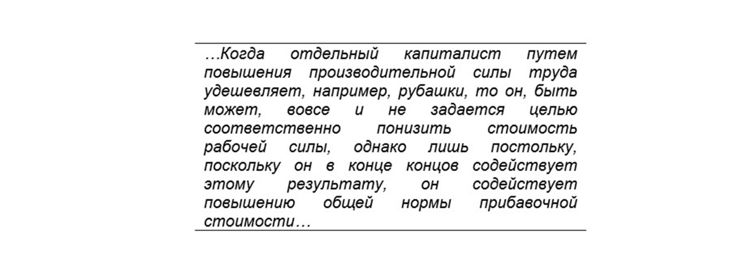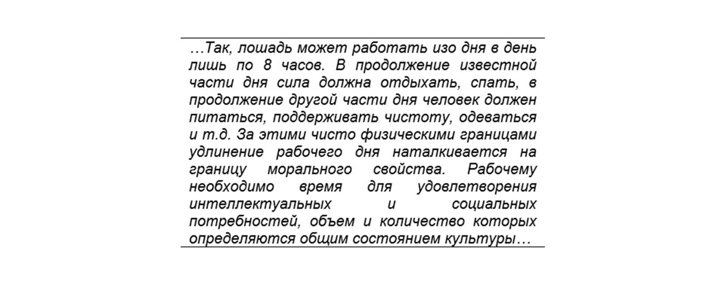 Удлинение рабочего дня. Весьма странный подход был использован, приводя в пример лошадь, приравнивая человека к ней, по всей видимости для сравнения силы и/или для обозначения наличия социальных потребностей у человеческой рабочей силы. Статистика в приведенном виде звучит странно, как будто сама лошадь сообщила о своих притязаниях на работу и отдых. Одним словом, это намекает как бы на следующее – смотри, рабочий, даже лошадь работает 8 часов в сутки, а ты же человек – должен работать еще больше. Если бы была полная воля капиталиста, то он бы давно уничтожил культуру, чтобы превратить человека в живого робота, хотя во многих неразвитых странах почти так все и происходит. Конечно, по-видимому, это был простой и удобный пример для объяснения обществу того периода суть вопроса, но, в любом случае, основной смысл абзаца достаточно кощунственный.