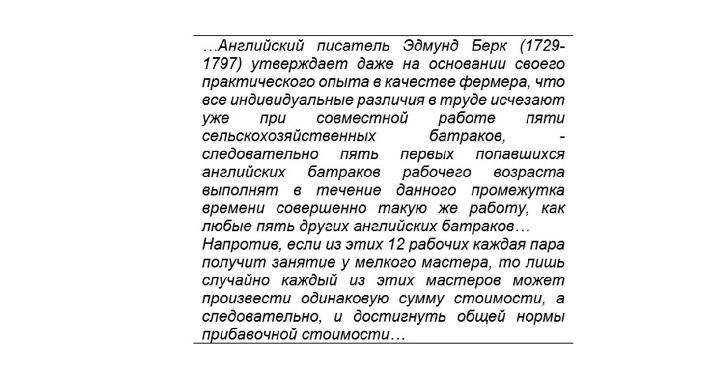 Норма труда. Такое ощущение, как будто закладывают «червя сомнения» в мысли трудящихся – «смотрите, вас много и каждого из вас можно с легкостью заменить на другого при коллективном труде, поэтому многого не просите, а иначе окажетесь в категории безработных». Можно быть уверенным, если капиталист возьмет на работу пять бездельников или пять профессионалов, он однозначно не получит одинаковый результат, тут дело даже не в лености кого-либо, а в том, что все люди разные – у кого-то больше навыков к определенным активностям, а у других – к другим, соответственно, надо подобрать нужных людей для определенных задач. Все это понимают, и система найма выстроена по большей степени именно таким образом, но стараются это пропустить с определенным умыслом или замыслом. Это самое откровенное жонглирование фактами.