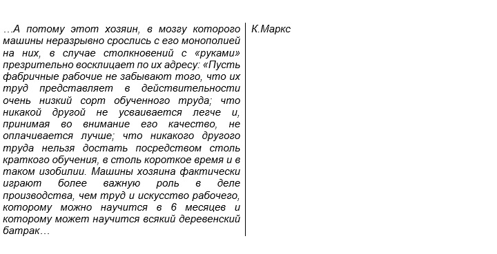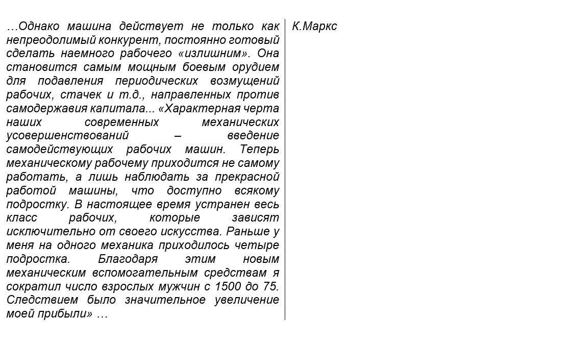 По своей сущности, машина – это только повод для более интенсивной и беспощадной эксплуатации рабочего капиталистом. Если оценить здраво, действительно, внедрение машины приводить к повышению производительности и, как следствие, снижению себестоимости, приводящему повышению прибыли капиталиста. Но капиталист не намерен хотя бы частично повысить благосостояние рабочей силы за счет полученной дополнительной прибыли. Скорее наоборот, он запугивает рабочего машиной и старается отобрать то малое, что он ранее получал. Одним словом, машина – это дубинка для рабочего, которая еще с большей интенсивностью эксплуатирует его, т.е. всю прелесть в двойном размере получает капиталист. В подтверждение этой мысли есть цитата: «Машины – средство производства прибавочной стоимости». У этого довода есть две оборотные стороны, первая, если углубиться – это прежде всего повышение прибыли капиталиста и только. А в другом, верно другое – пока это конкурентное машинное преимущество не будет внедрено на других производствах других капиталистов, тем самым снижая себестоимость производства по всей отрасли, оно может привести к падению стоимости товара на рынке. Но это не факт и далеко не так, т.к. ни в коем случае нельзя забывать о главном принципе капитализма – максимизация прибыли путем сговора между собой. Одним словом, они крайне мотивированы снизить себестоимость, но только для извлечения дополнительной прибыли.