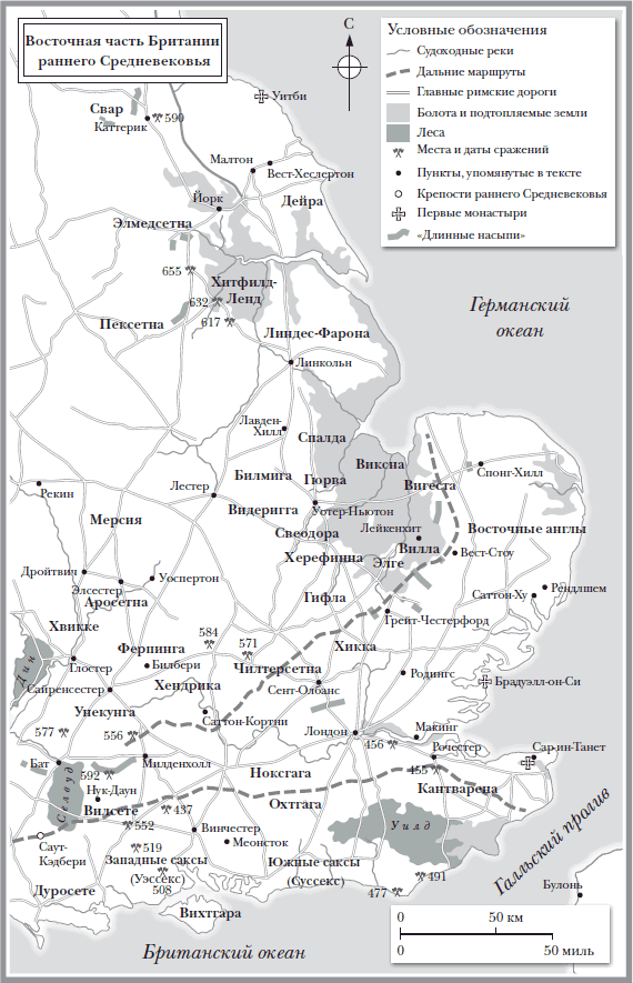 Даже от отдельных стоп-кадров трудно оторвать взгляд: это обрывки истории, начало которой теряется во тьме, а конец описан несколько столетий спустя прославленным книжником раннего Средневековья Бедой Достопочтенным. Сей образованный и любознательный монах из монастыря Ярроу на реке Тайн, который знал о мире почти все, что только можно было знать в его время, решил написать о том, как англосаксонские короли были избраны Богом, чтобы утвердить на острове единую общую церковь и создать единый народ. Он писал о нечестивых, глупых бриттах, которые, отвергнув благотворное влияние христианской Римской империи, отвернулись от Бога и от своих законных правителей и в итоге погрязли в междоусобицах и тирании. Он рассказывал о том, как предводители языческих германских племен начали войну против бриттов – и покорили их, как они создали новые могущественные королевства и как их, в свою очередь, обратили в истинную веру две христианские миссии, одна из монастыря на острове Иона, а вторая из Рима – примерно за три четверти века до Беды. История Беды убедительна – на самом деле это единственное достойное доверия повествование, не сгоревшее в тиглях раннего Средневековья Британии[2]. Мы можем сомневаться в его мотивах и в некоторых из его источников, но даже Беда мало что мог сказать о полутора веках, отделяющих последние письменные донесения из римской провинции Britannia от прибытия из Рима на остров Танет миссии Августина[3] в 597 году: этим полутора векам посвящено всего девятнадцать строк из 300 страниц современного английского издания его «Церковной истории народа англов»[4]. Однако даже если истинность рассказа Беды о том, как возникли первые христианские королевства, проверить нельзя, можно все-таки надеяться обнаружить гудящий пощелкивающий механизм, который вдохнул жизнь в эту драму, увидеть ее действующих лиц и наблюдать их трагикомическую историю.