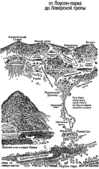 Пройдя вниз по склону около мили, Раф с Шустриком выбрались на дорогу, которая шла по восточному берегу Конистонского озера. Ветер совершенно стих, все было абсолютно безмолвно и пустынно – в такой ранний час на дороге не было и автомобилей. Само же озеро, когда оно проглядывало между деревьев, лежало такое ясное и гладкое, что камни, опавшая листва и побуревший тростник на болотистом мелководье казались некими предметами обстановки в заброшенном доме, если заглянуть в него через окно. Однако, когда озеро показалось в следующий раз, это впечатление под взрывным напором бледного солнечного света бесследно исчезло в отражениях бегущих облаков и многоцветных осенних крон деревьев, которые стояли вдоль берега.