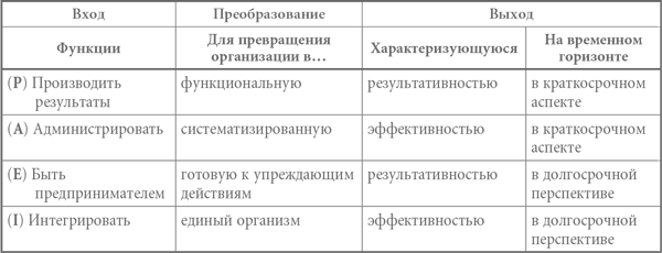 Эти функции таковы: Producing results – производство результатов, ради которых существует данная организация и которые определяют ее результативность, Administering – администрирование, обеспечивающее эффективность, Entrepreneuring – предпринимательство, обеспечивающее управление изменениями, и Integrating – интеграция, объединение элементов организации для обеспечения ее жизнеспособности в долгосрочной перспективе.