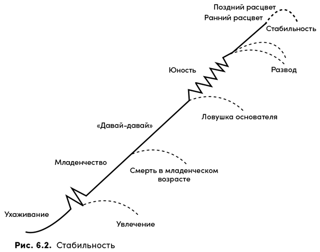 Очень трудно различить, находится ли компания в состоянии Позднего расцвета или уже перешла на этап Стабильности (рис. 6.2). Ее поведение в обоих случаях оказывается практически одинаковым. Различие состоит лишь в частоте, с которой будут проявляться признаки Расцвета, и в том, как долго станут сохраняться соответствующие типы поведения. По этой причине я представляю состояния Позднего расцвета и Стабильности в качестве единого этапа жизненного цикла.