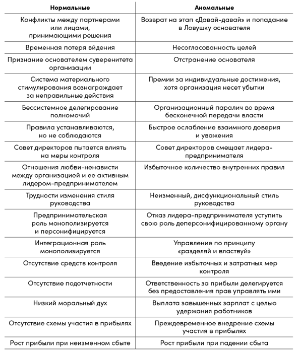 Трехмерный конфликт, описанный выше, – это нормальное явление в организации, вступившей в пору Юности. Патология возникает тогда, когда те, кто осуществляет формальный и неформальный контроль принятия решений в компании, начинают страдать от потери взаимного уважения и доверия[56]. Люди с предпринимательскими талантами перестают чувствовать возможность реализации новых идей и возможностей. «Почему, – спрашивают они, – мы должны заниматься всякой ерундой?» Они любили компанию, когда она была маленькой и гибкой. Теперь, когда она стала негибкой или политизированной, она перестала вызывать у них прежние чувства. Поэтому они покидают компанию. Но их уход может породить патологический феномен.