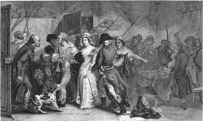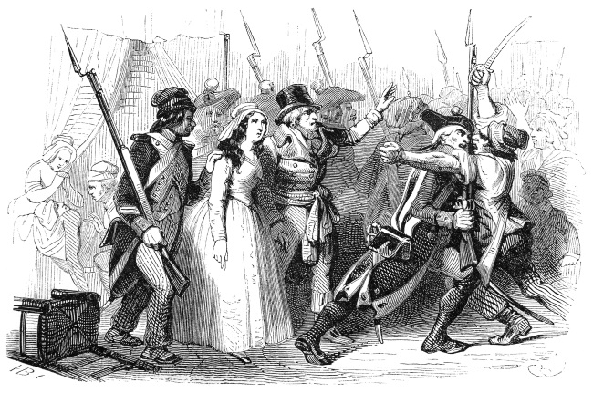 Экономка прибежала; рассыльный, складывавший листки в другой комнате, тоже; они нашли Марата плавающим в своей крови, а Шарлотту – спокойной, с просветленным лицом, стоящей неподвижно. Рассыльный ударом стула свалил ее на пол, экономка топтала ее ногами. На шум сбежался народ; в одну минуту весь квартал поднялся на ноги. Шарлотта встала с пола и с достоинством вынесла все поругания и побои. Несколько членов секции, тоже привлеченные шумом, были так поражены ее красотою, мужеством и спокойствием, с которым она созналась в своем поступке, что не дали ее растерзать на месте и увели в тюрьму, где она продолжала с той же уверенностью подтверждать свою вину.