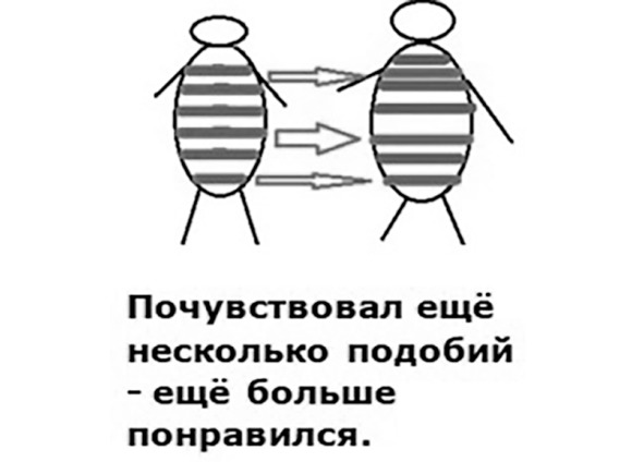 При этом отметим, что количество подобий в родных половинках мужчины и женщины – огромное множество. Но, не одно! Таким образом, данный мужчина отметил в данной женщине лишь одно (из множества) подобие с данной женщиной. Реакция – понравился. Почувствовал ещё одно подобие с ней – ещё более эта женщина понравилась. Ещё одно подобие – и ещё больше она стала ему нравиться.