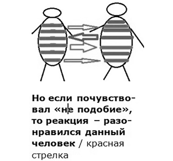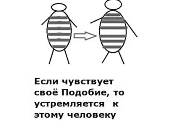 Итак, появляется ощущение: этот человек мне НРАВИТСЯ. Почему он нравится, человек не осознаёт. Человек не может осознать процесса узнавания своего подобия. Можно сказать: душа человека устремилась к другому человеку, который, не понятно почему, но понравился.