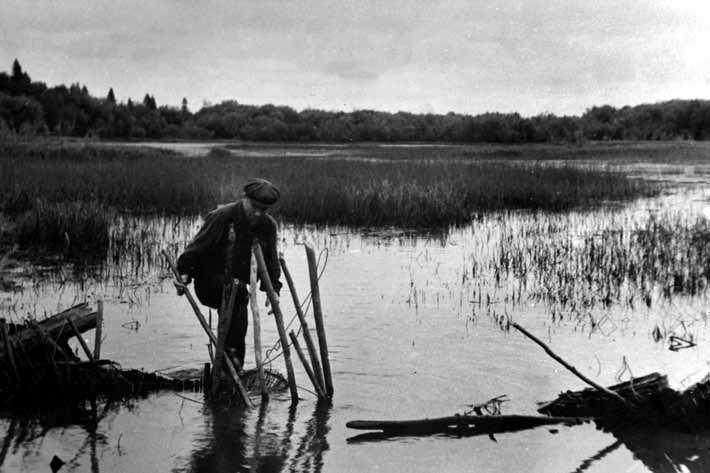 Установка рыболовных вершей. Из коллекции музея «Дом деда Мартына». Фото И. Веселовой. Июль 2007 г. Деревня Селище Лешуконского района Архангельской области