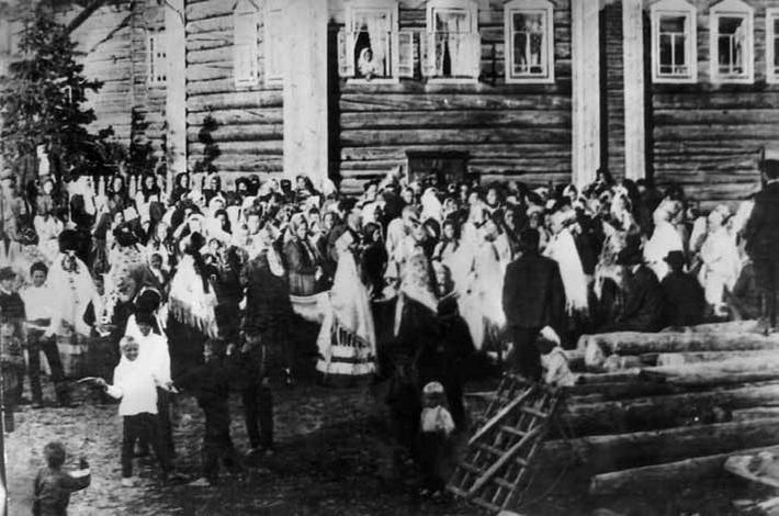Праздничное гуляние на Иванов день в селе Погорелец Мезенского уезда Архангельской губернии, 10-е – 20-е годы ХХ века. Из коллекции музея села Дорогорское. Фото В. Беркутовой. Июль 2007 г. Мезенский район Архангельской области