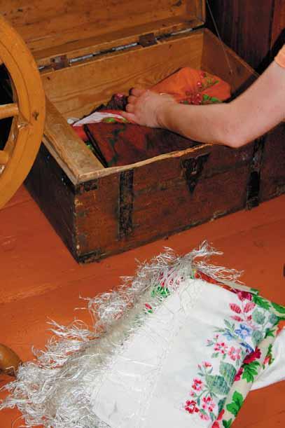 Сундук с приданым Пелагеи Яковлевны Дьячковой (1923 г. р., уроженки д. Азаполье). В нем хранятся сарафаны ее мамы, шали, накопленные за всю жизнь. Фото И. Веселовой. Июль 2008 г. Деревня Азаполье Мезенского района Архангельской области