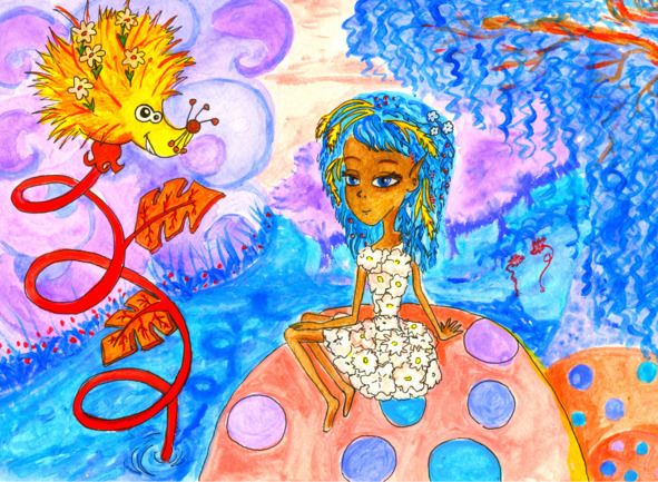 На берегу бирюзовой реки сидела Дель. Её тело было чем-то похоже на человеческое, только очень тоненькое, оно будто состояло из бронзовых гладких палочек, поблескивающих на солнце. Она была немного ниже Милены, но значительно выше Мишутки. На теле не было одежды, но были цветы и листья, которые принимали вид коротенького белого сарафанчика. Большие бирюзовые глаза, а на голове вместо волос целая клумба из необычных красивых растений. Дель сидела на камне в разноцветный горошек и слушала, что ей говорит беп-растение, которое корнями уходило в воду, а верхняя часть извивалась на длинном стебле.