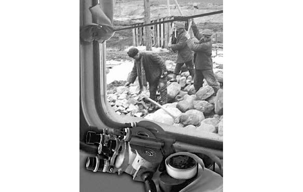 Далее камера обзорно показывала весь вагон, где почти все места были заняты, но толчеи не было. Люди разговаривали, читали, спали, в окна практически никто не смотрел – мало кого интересовала привычная картина. Но фокус оператора сместился, и камера стала наезжать на окно… Появилось стекло вагонного окна с косыми полосами – за ним, оказывается, существовал совсем иной мир. Там, за мокрой решёткой дождя, казалось, двигались ватники и шинели, лишённые голов и ног, поскольку конечности, по неизвестной причине, оказались не в фокусе. Серые ватники везли тачки по деревянным настилам, рыли канавы, разгружали брёвна и кирпичи из вагонов, таскали на себе мешки. Создавалась иллюзия, что небо опустилось на их головы, светлым пространством была лишь узкая полоса, ограниченная деревянными бараками. По краям железной дороги шли столбы с колючей проволокой. Колючка была растянута не только между опорами, но ещё скручена в большие мотки, рядом с ними маячили суровые шинели. Эдакая полная иллюзия паучьего пространства!..