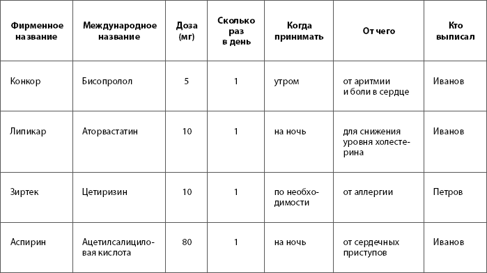 Составьте список принимаемых лекарств и носите копию с собой в бумажнике или кошельке (ниже предлагается таблица, в форме которой можно составить подобный список). При визите к врачу берите с собой копию списка, обсуждайте его с врачом и просите его оставить копию в вашей карте. Это особенно полезно, если вы принимаете лекарства, которые выписывают разные врачи. Зачем писать и международные непатентованные, и фирменные названия? Если препарат появится в другой форме, вы его узнаете по непатентованному названию. Обязательно включите в список и его.