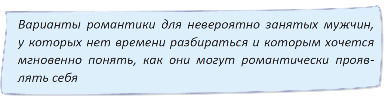 Помните об этой несложной арифметике. Именно по этой простой причине романтика необходима мужчинам так же сильно, как и женщинам. Ведь жена вас и полюбила за добрые дела, и будет сильно любить и дальше, если вы научитесь привносить в вашу совместную жизнь приятные романтические пустяки. А не повторять грустные ошибки мужчин, которые делают жене подарки ровно четыре раза в год: на Новый год, 8 Марта, годовщину свадьбы и день рождения. Потому что уверены, что огромный букет в важные даты обеспечивает любовь жены. С ее же точки зрения, четыре букета за 365 дней равны формальности и тому, что она перестала быть для мужа желанной и важной. Вместо того чтобы осуждать женщину – как она может судить обо мне и наших отношениях всего лишь по каким-то букетам? – давайте разберемся, как сделать женщину счастливой, фактически ничего не делая.