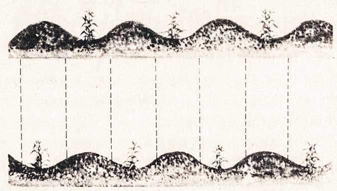 Деление поля на квадраты представляет собой деление на участки, в которых возможен застой воды и разводимых навозных удобрений, что помогает снизить почвенную эрозию. Наиболее раннее упоминание о гнездовой посадке встречается в «Книге Фань Шэнчжи» времён правления Хань Чэн-ди48, где описаны две разновидности этого метода. Первый способ – это деление на канавы, которое подходит для равнинного земледелия. Большой участок длиной 487 м и шириной 108 м делился по горизонтали на 15 частей, между каждой вырывалась канава в 2,7 м глубиной и шириной и длиной в 27 м, в которую высаживались культуры.