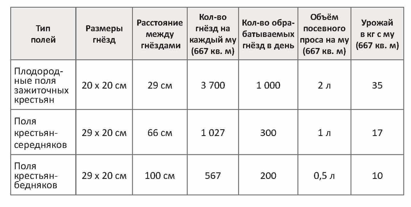 Второй способ – это деление поля на гнёзда, характерное для небольших участков земли. Поле делится на равноудалённые квадраты или круги, глубина и размер которых зависят от высаживаемых культур. Согласно записям в «Книге Фань Шэнчжи», при втором способе гнездовой посадки поля подразделялись по экономическому статусу владельцев: существовали участки для зажиточных крестьян, крестьян средней руки и бедняков. «В одно гнездо положить 20 зёрен проса, удобрить одним шэном49 навоза и несколькими сортами земли», – так говорится про богатые участки, но нет никаких упоминаний о том, использовались ли удобрения на участках бедняков и среднего класса. Участки в форме гнезда подходят для выращивания проса, пшеницы, соевых бобов, тыквы-горлянки, сладкого картофеля и др.