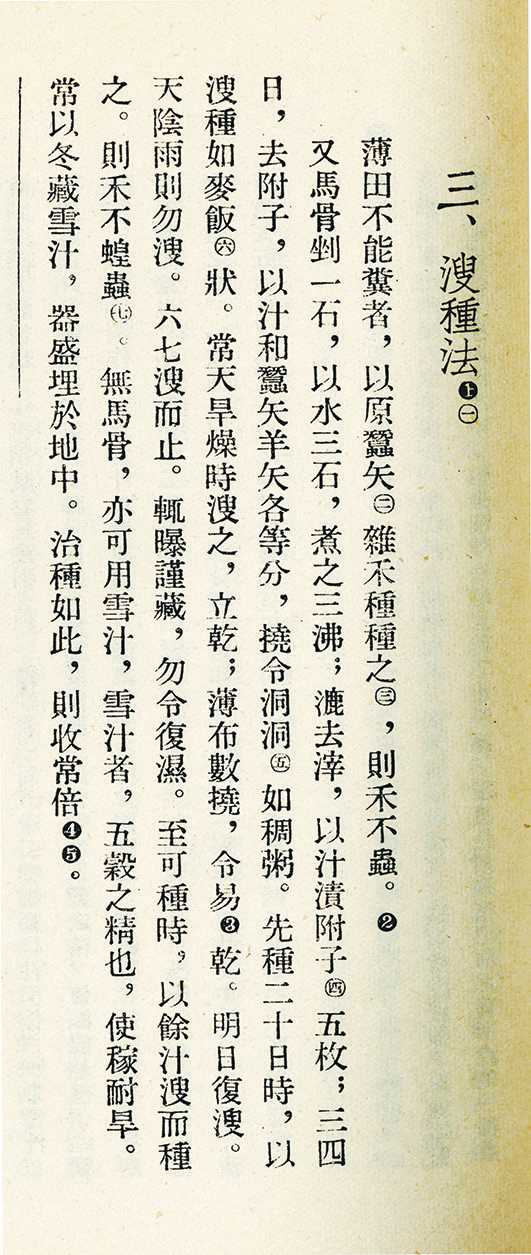 Костный отвар содержит костный клей, действующий как связующее звено для соединения экскрементов тутового шелкопряда и навоза овец. Аконит – это высушенный корень борца кармихеля, содержащий токсичные компоненты, в частности аконитин, вызывающий лихорадку. Высокотоксичные травы хорошо зарекомендовали себя в борьбе с подземными вредителями. После основания Китайской Народной Республики учёные провели ряд экспериментов по замачиванию семян древними методами, добившись повышения урожайности на 85 %. Анализ выявил три основные причины высокой эффективности замачивания: во-первых, оно способствует прорастанию семян; во-вторых, обеспечивает семена питательными веществами, необходимыми для роста; в-третьих, способствует росту корневой системы, повышая засухоустойчивость всходов.