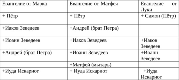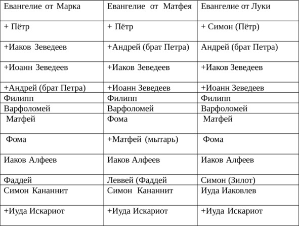 Вернёмся же к спискам апостолов, сравним их и обозначим знаком + (плюс) имена тех из них, которые упоминаются в каждом из этих Евангелий ещё хотя бы раз.