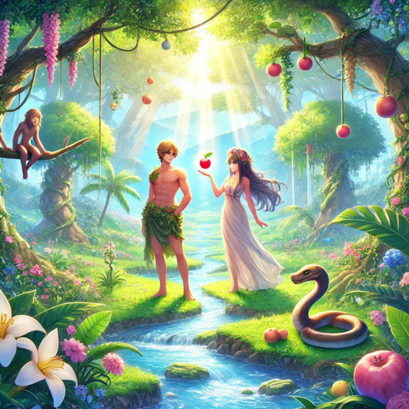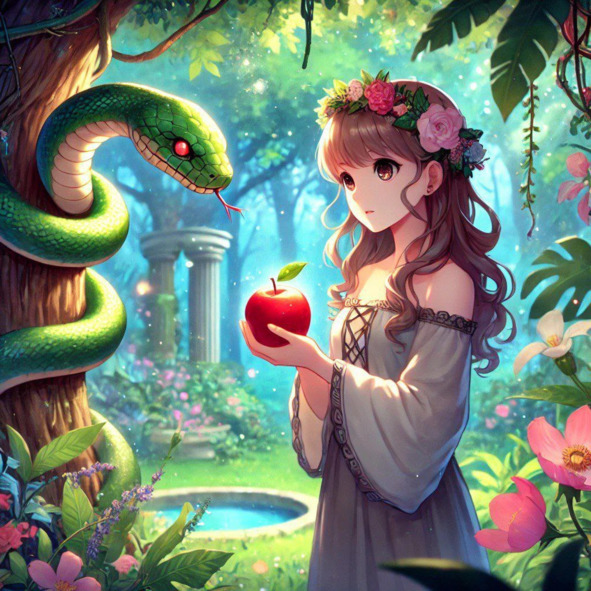 Когда Адам и Ева были еще очень молоды, и у них даже еще не было детей, они просто любили друг друга и наслаждались жизнью в раю. Они питались разными плодами. Но Бог запретил Адаму и Еве есть плоды одного из деревьев. Это было Дерево познания добра и зла. Бог предупредил их, говоря: «В тот день, когда вы вкусите плодов с этого дерева, вы умрете». Но, как только Адам ушел по делам, и Ева осталась одна, сатана, тут же, подошел к ней в образе змея и начал ее искушать. Как это было, в подробностях, не написано, но вполне могло быть вот так.