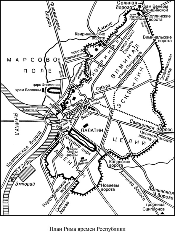 На рассвете шумные толпы народа стали занимать улицы и площади города, откуда можно было увидеть шествие. Двери храмов распахивались настежь. Святилища наполнялись венками и благовонными курениями. На Форум, Велабр и Бычий рынок сходились тысячи зрителей. Они поднимались на деревянные ступенчатые помосты, специально сооруженные там по случаю большого торжества. Со склонов Палатинского и Авентинского холмов нескончаемые вереницы людей, все в белых праздничных одеждах, спускались в Мурцийскую долину, к Большому цирку. Из густонаселенных кварталов Эсквилина, Виминала и Квиринала оживленные и крикливые толпы, двигаясь по извилистым и тесным улицам к Фонтинальским, Санквальским и Карментанским воротам, высыпали за городские стены, на Марсово поле6, которое уже все пестрело, словно цветами, яркими нарядами участников предстоящего шествия. Зрители частью собирались на Овощном рынке, близ Карментанских ворот, частью заполняли портики храмов Дианы и Всаднической Фортуны, стоявшие на пути к Фламиниеву цирку, или спешили прямо в цирк, где согласно обычаю должен был начаться триумф.