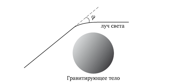 Рис. 1. Без гравитирующего тела траектория света была бы прямой. В его присутствии угол отклонения света φ определяется массой тела, а также расстоянием между его центром и лучом