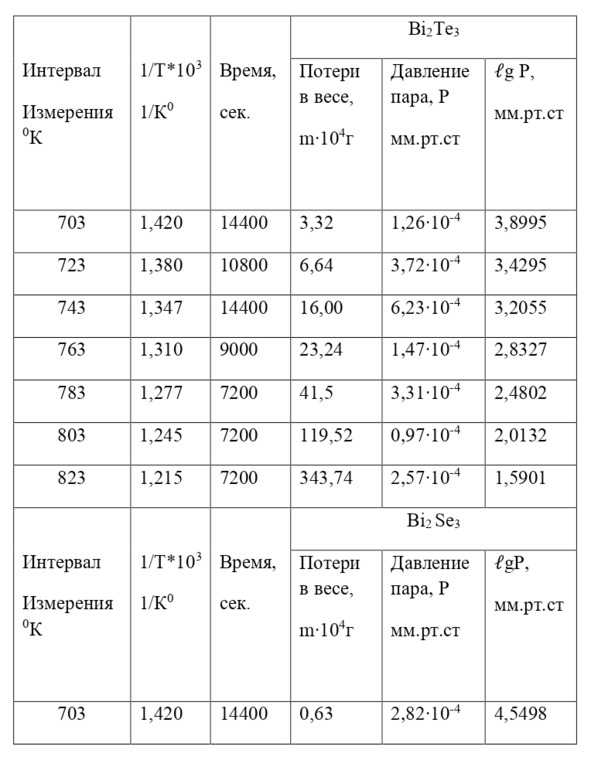 Изменение состава сплавов во время опыта не учитывалась, так как полная потеря вещества после завершения всей серии измерений с одним составом не превышала 0,5% веса. Для каждого опыта по потере веса в эффузионной камере рассчитывалось количество испарившегося теллурида висмута и селенида висмута. Результаты исследования представлены в ниже приведённой таблице 1.